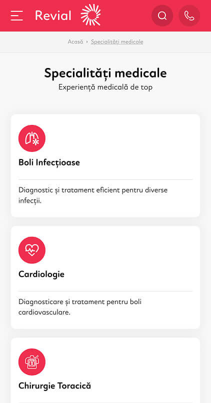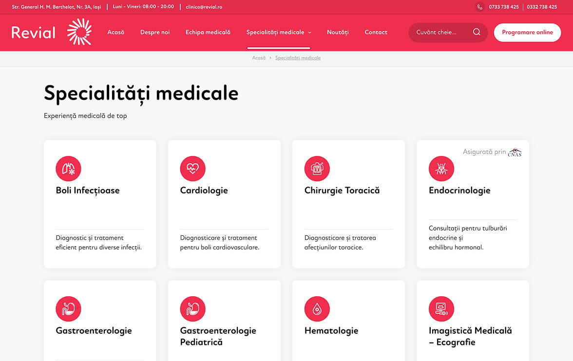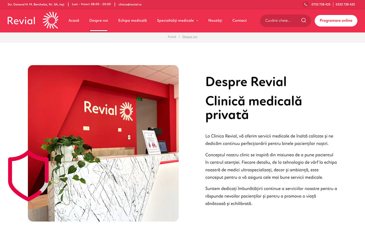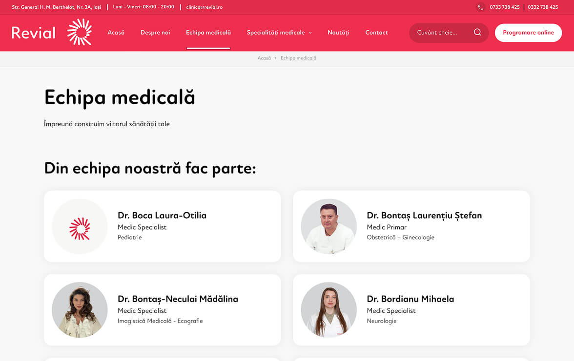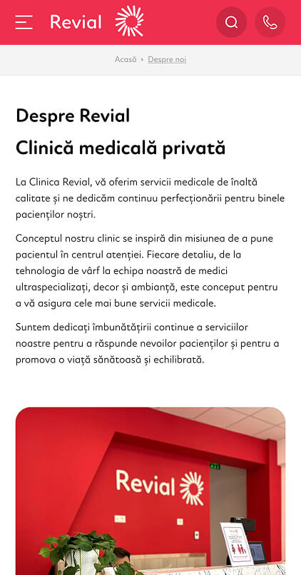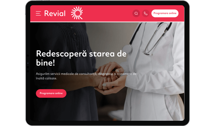 In developing the online presence for Clinica Revial, we focused on a modern, airy and intuitive design, which reflects the professionalism, empathy and state-of-the-art technology of the clinic. The website allows quick access to information about specialties, medical team, services and appointments, being optimized for mobile, tablet and desktop. The design highlights the values of the clinic — professionalism, empathy, integrity, collaboration, innovation and progress — offering patients an online experience as safe and clear as a visit to the clinic.