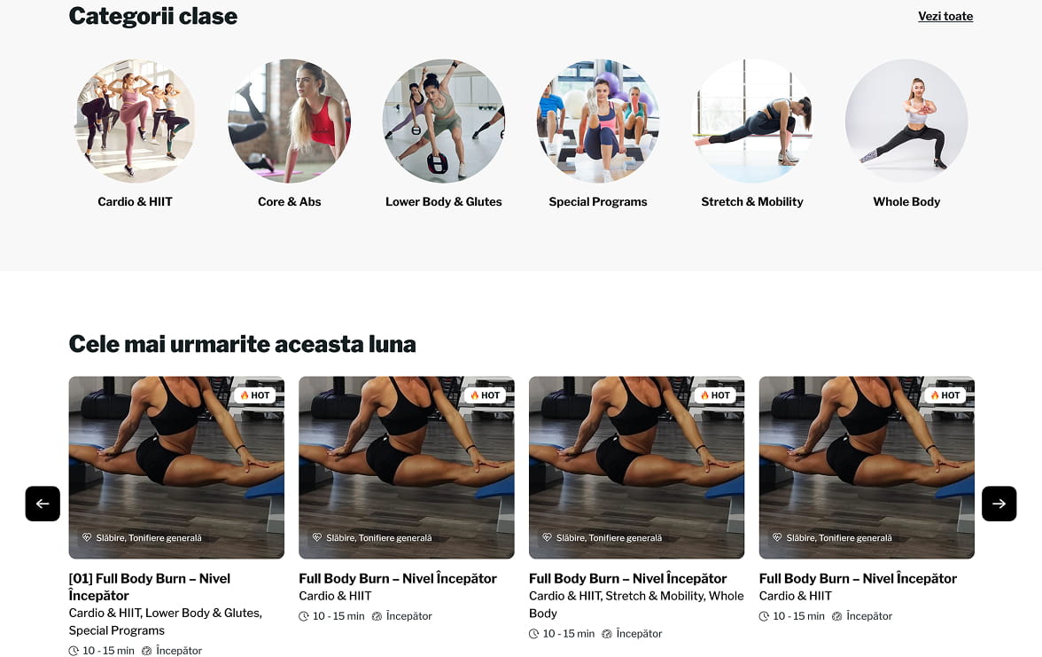 The website is designed to support a clear and motivating experience, structuring programs by workout types and difficulty levels so that users can quickly identify what suits them. The design is modern and dynamic, with motivational images and easily accessible sections that encourage exploration and engagement. The UI is intuitive and streamlined for all types of devices, with visible CTAs for “See all programs” and logical navigation between categories, facilitating a natural transition from discovery to enrollment or purchase.