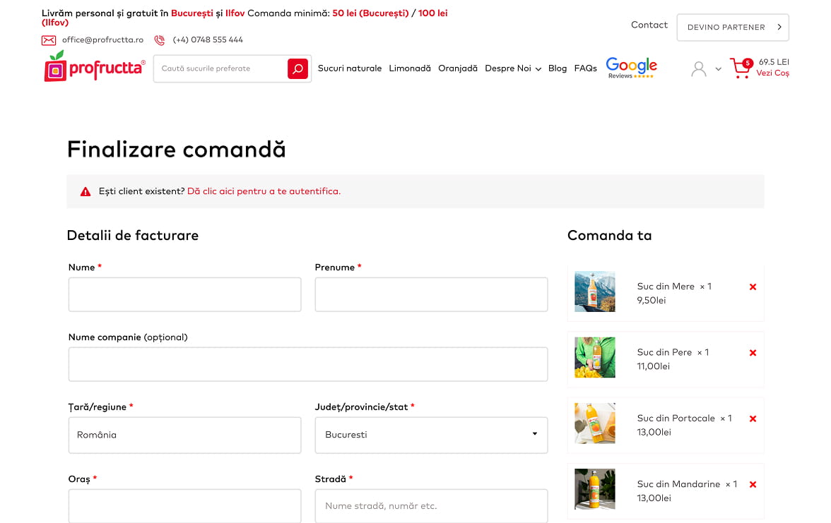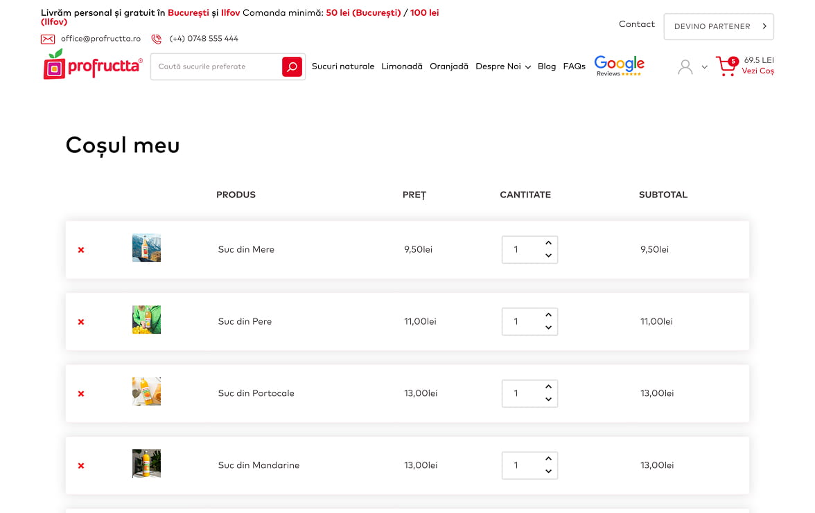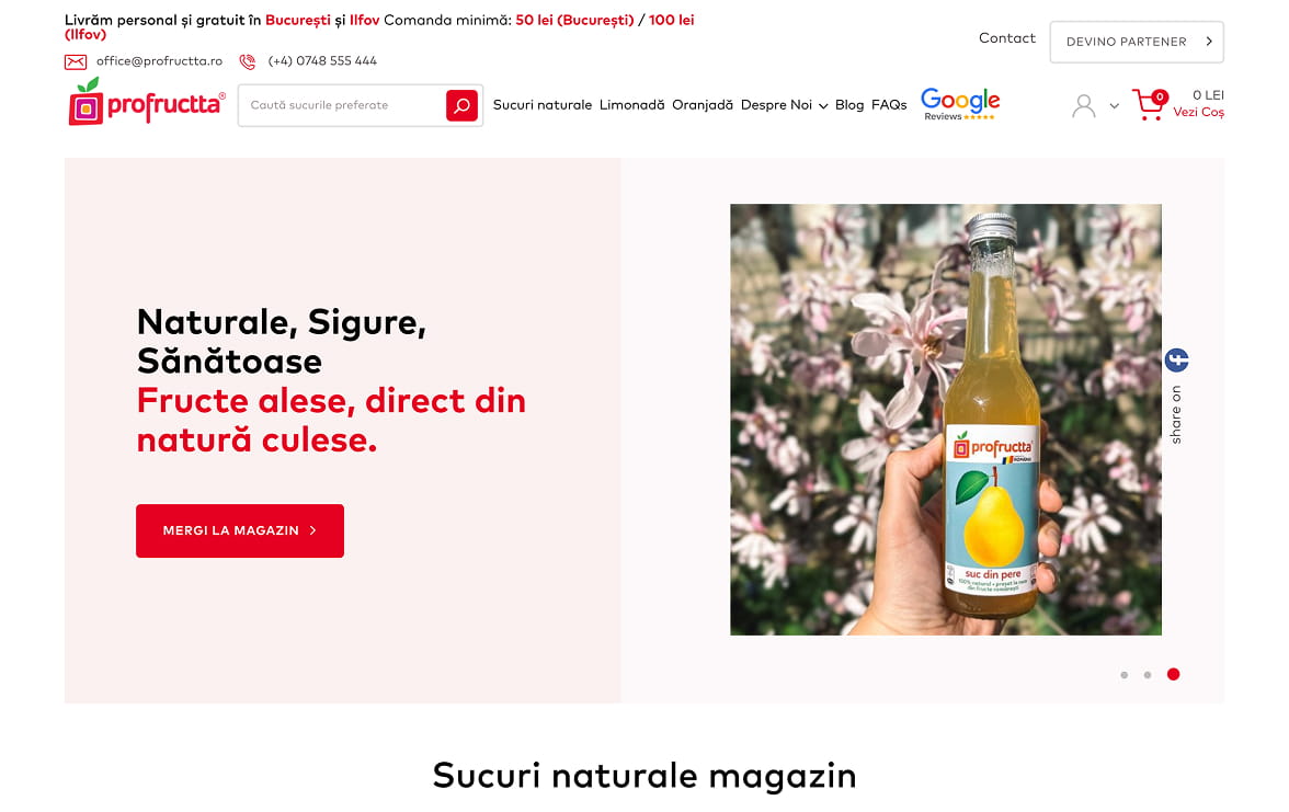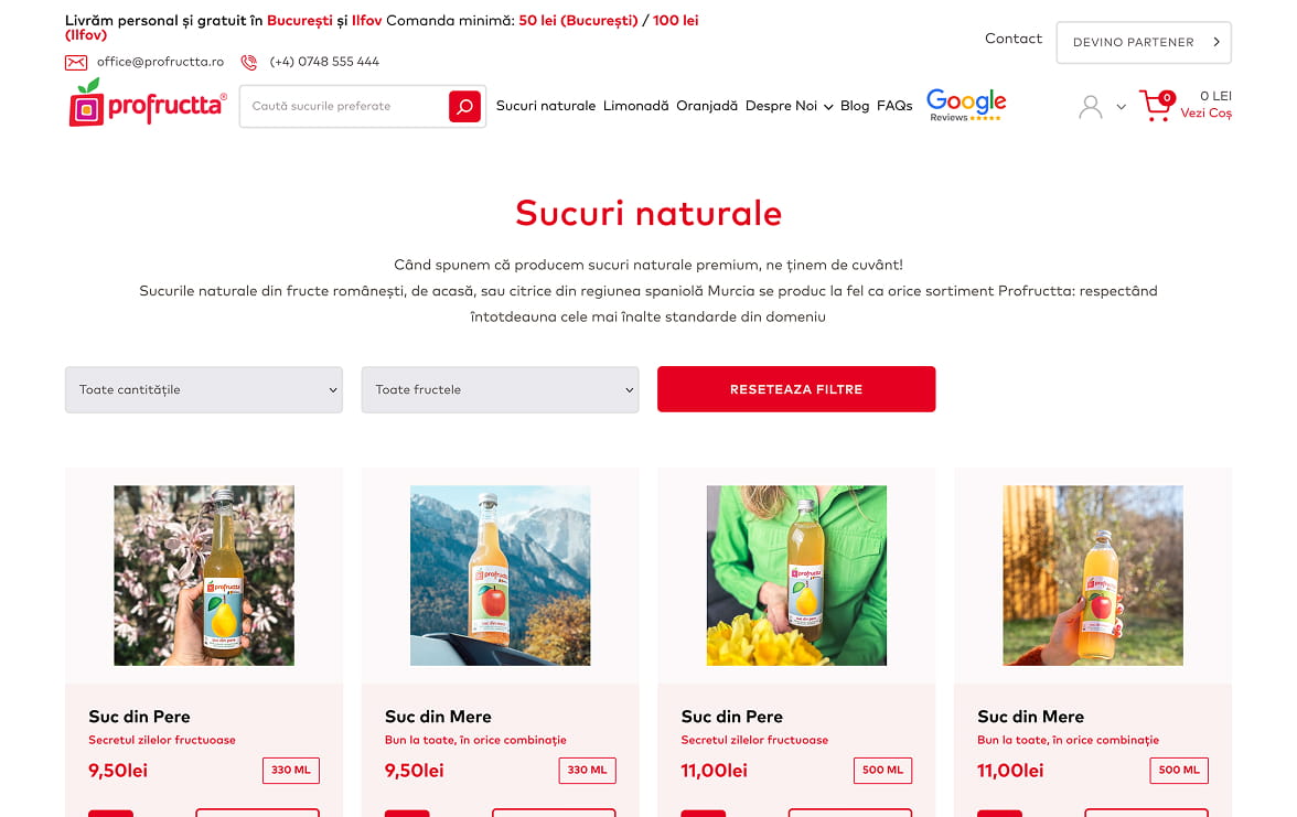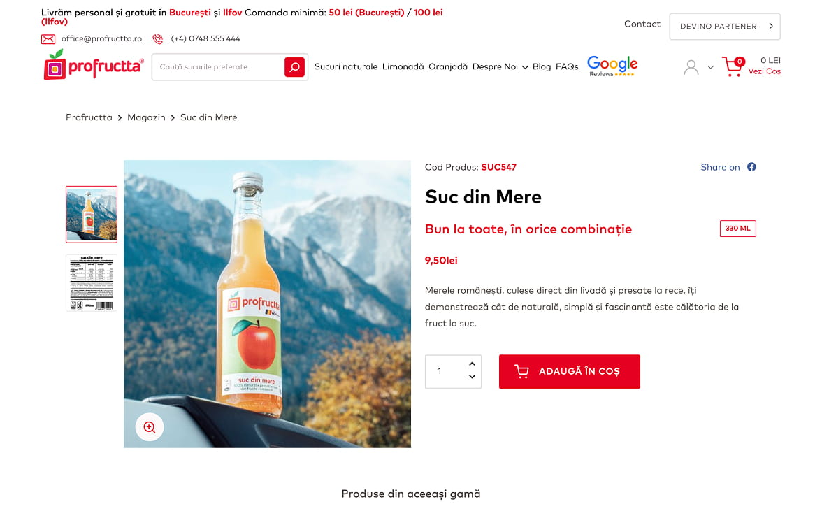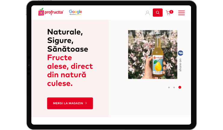 The first meeting with the Profructta team was an open and authentic one, in which we discovered a Romanian brand dedicated to natural taste and uncompromising quality. We were impressed by the attention paid to each stage of production, from fruit selection and cold pressing, to glass bottle packaging and personal delivery. Their vision of bringing back natural juices as we knew them from childhood convinced us that it was essential to build an online presence that reflects the brand’s transparency, naturalness and premium standards.