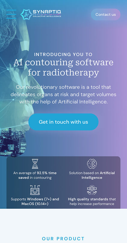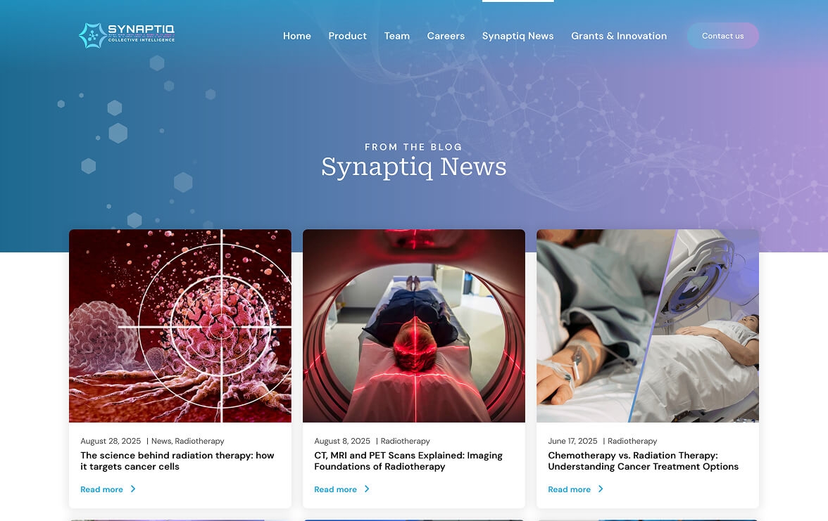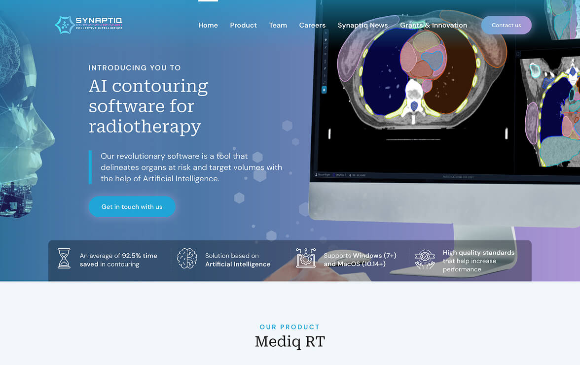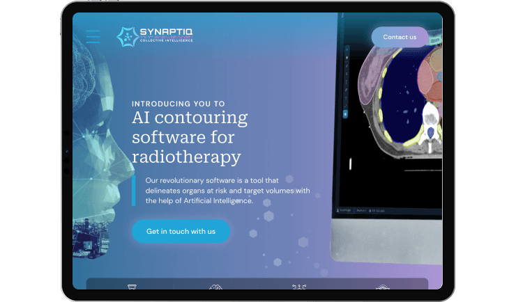 Synaptiq is a medical technology brand dedicated to improving radiotherapy through artificial intelligence. Their products enable oncologists to save time, increase treatment precision, and provide patients with faster and more efficient plans, transforming the radiotherapy experience.